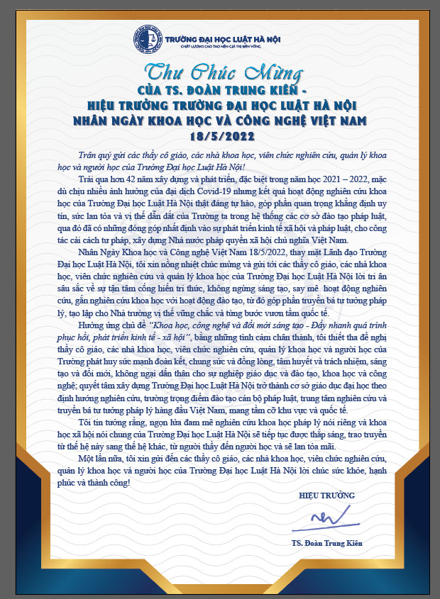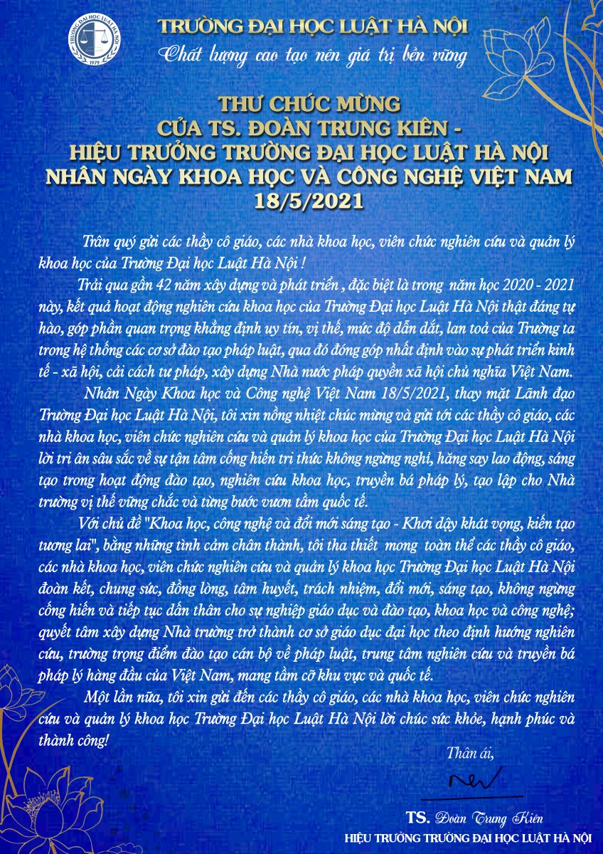 Thư chúc mừng của Hiệu trưởng Trường Đại học Luật Hà Nội nhân Ngày Khoa học và Công nghệ Việt Nam 18/5/2021